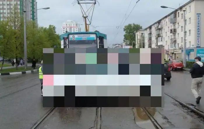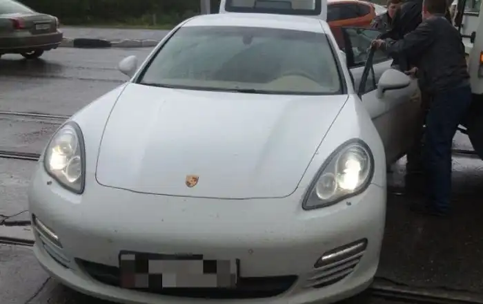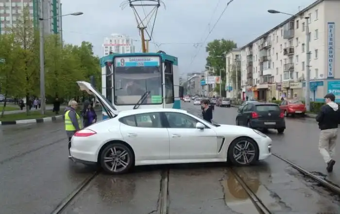 А вот и итог столкновения. Если бы у трамвая была скорость чуть больше - присоединение и "инсталляция" нового люксового вагона в виде Porsche Panamera к городскому трамваю, была бы полностью завершена ))