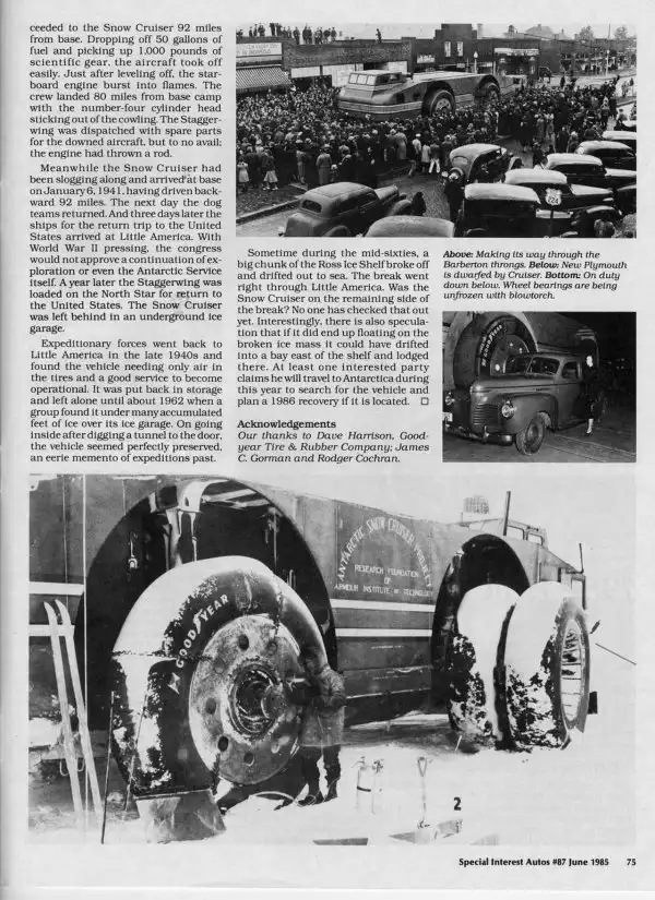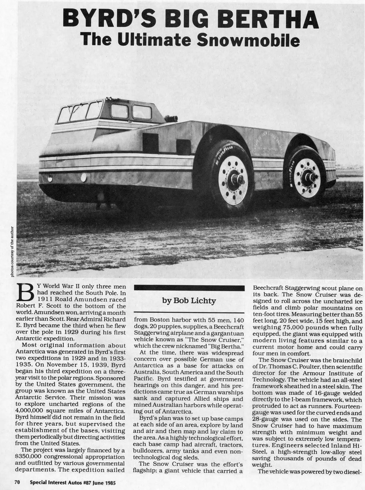 Однако они были разбиты в пух и прах Popular Mechanics, чья статья «Снежный вездеход для изучения Антарктики» была напечатана в октябре 1939. Согласно их докладу, огромный монструозный автомобиль, предназначенный для «восхождения на полярные горы и переправ через гигантские трещины», был пятидесяти пяти футов в длину и пятнадцати в ширину.