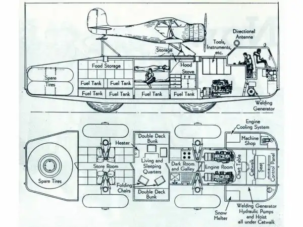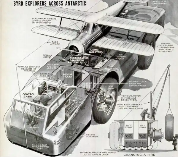 Popular Mechanics также сообщил, что биплан военно-морского флота, который «оборудован семидюймовой картографической камерой», был установлен на корпусе вездехода таким образом, чтобы его можно было «поднимать наверх при помощи лебедки и спускать на снег за десять минут».