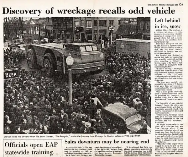 «Гигантский снежный вездеход, специально разработанный для того, чтобы перемещаться через огромные трещины и зубчатые гребни льда, может стать основным оборудованием экспедиции Берда. Вездеход был разработан доктором Томасом С. Пуитером из Чикаго, заместителем Берда в экспедиции 1933-35 гг.