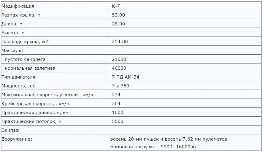 К-7 проектировался как многоцелевой самолет гражданского и военного применения. Один из пассажирских вариантов предусматривал перевозку 128 пассажиров на расстояние до 5000 км. Другой вариант - "люкс" - предполагал установку в крыле двухъярусных пассажирских кабин по 8 человек в каждой - всего 64 спальных места. В машине располагались комфортабельная кают-компания, буфет, кухня и радиорубка. Конструкция впервые позволяла механикам самолета подходить в полете непосредственно к работающему двигателю, а пассажирам осматривать "пролетающую" местность в окна-иллюминаторы.