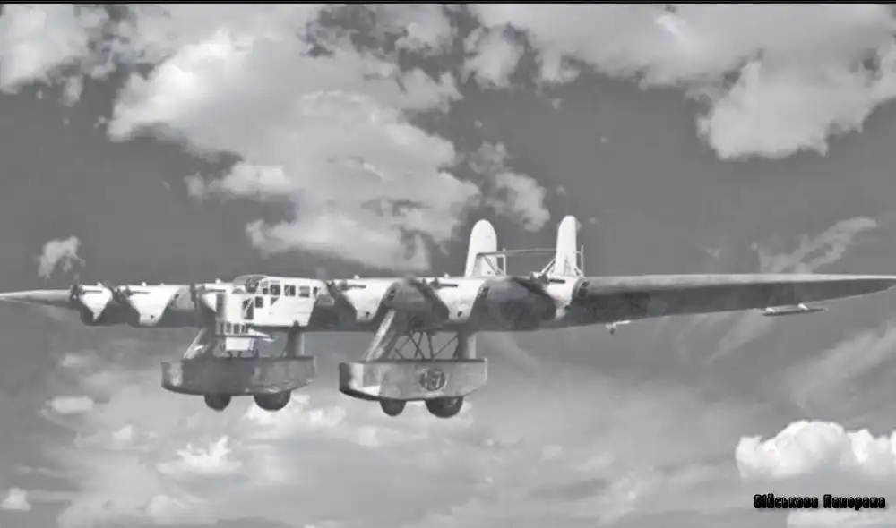 Первоначально самолет рассчитывался под шесть двигателей БМВ, но затем было принято решение установить отечественные АМ-34. В процессе работы из-за малой тяги шести основных двигателей водяного охлаждения Калинин пошел на вынужденную меру: ему пришлось установить седьмой толкающий двигатель на задней кромке крыла между хвостовыми балками. Конструктор понимал, что этот двигатель существенно повысит турбулентность воздушного потока, что, в свою очередь, может вызвать вибрацию всей конструкции. Но другого выхода у него не было. Ведь двигатели АМ-34 тогда еще не имели редукторов и развивали мощность всего в 750 л. с. От заднего лонжерона крыла к хвосту шли треугольные балки ферменного типа с дутиками, предохранявшими самолет от случайного касания земли. Оригинальная конструкция шасси позволяла иметь самолету горизонтальное стояночное положение. Шасси состояло из двух широко разнесенных тележек ферменной конструкции с масляно-воздушной амортизацией колес, впервые примененной в отечественной практике для тяжелых машин. Также впервые на самолетах подобного класса использовали и колеса баллонного типа "Гудьир". Наша промышленность таких колес не выпускала, и в дальнейшем необходимо было их специальное изготовление. Тележки шасси имели по три колеса и были оборудованы обтекателями - "штанами" из листового металла, причем в левой размещалась входная дверь и лестница в крыло.