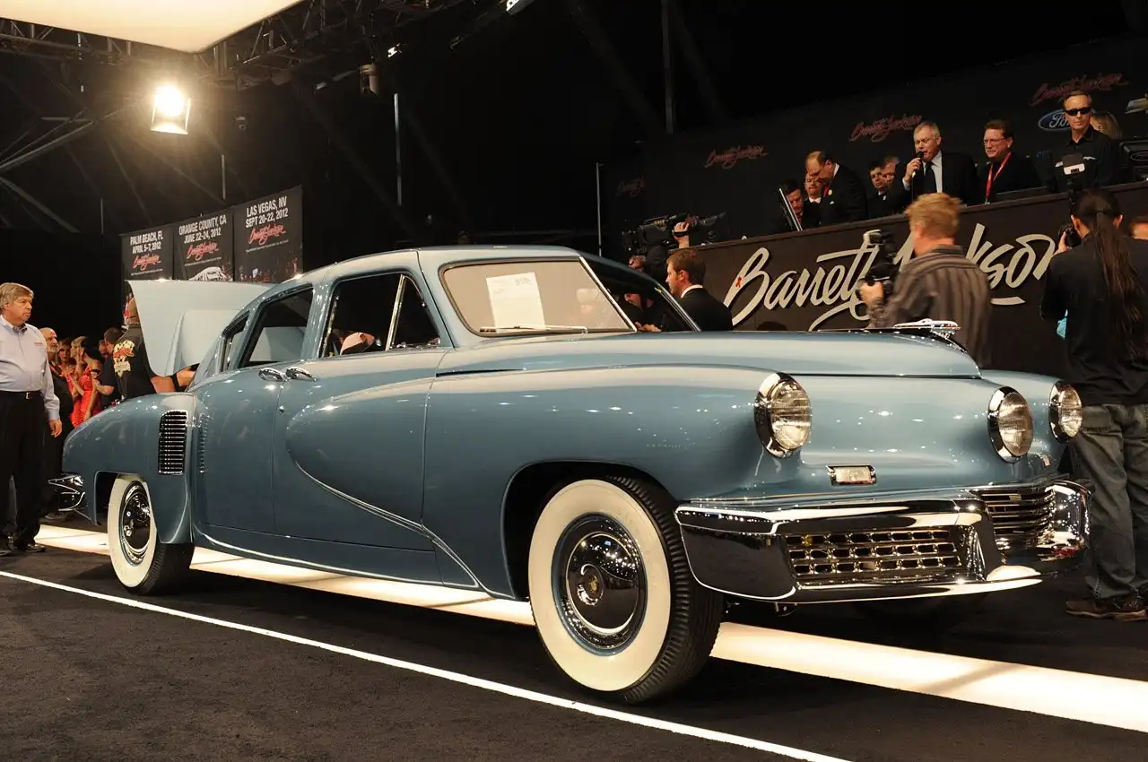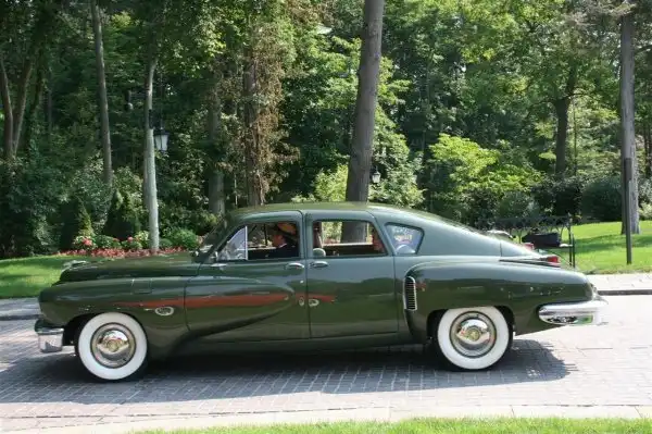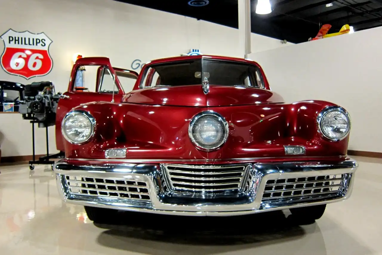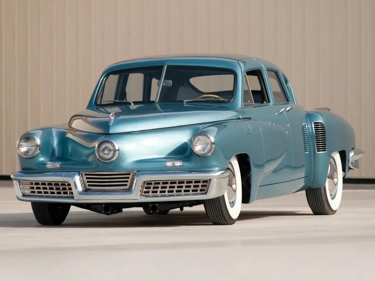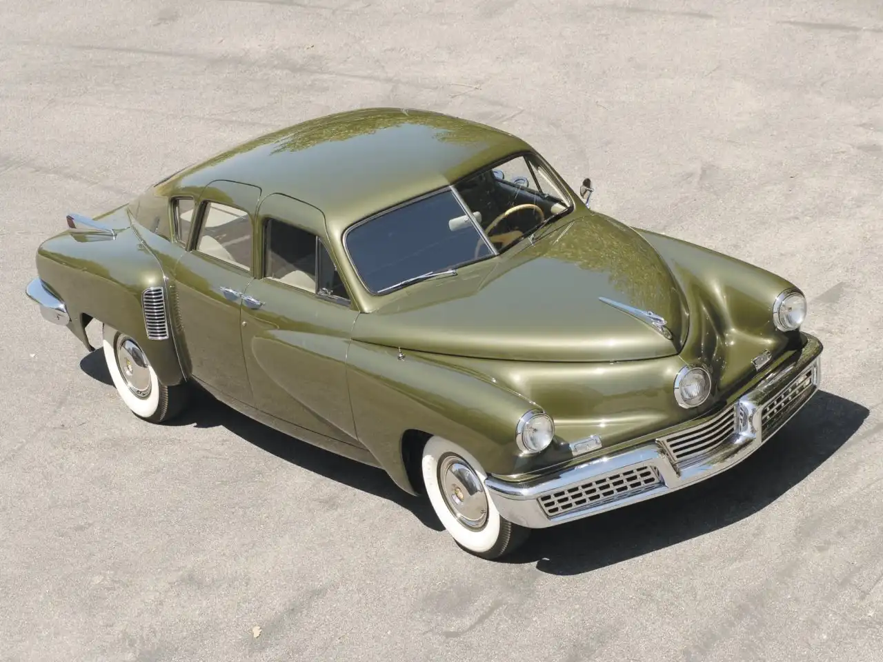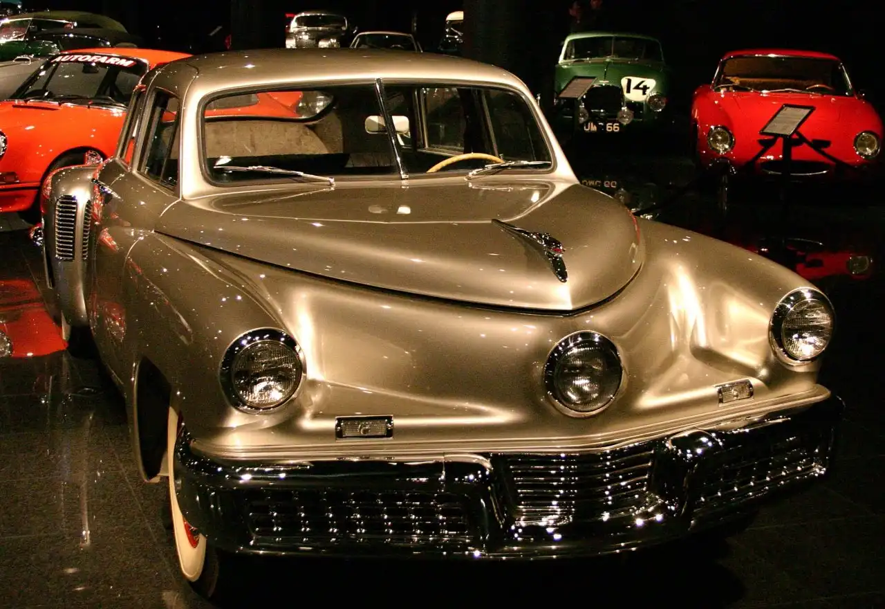 «Таккер Торпедо», который обеспечивал высокую безопасность пассажирам и развивал максимальную скорость более 200 км/ч. Он имел оригинальный кузов достаточно совершенной по тем временам аэродинамической формы с тремя передними фарами, оппозитный 6-цилиндровый двигатель рабочим объемом 9650 см3, располагавшийся в задней части кузова.Этот силовой агрегат был установлен наклонно сзади автомобиля, а рулевое колесо располагалось перед центральным сиденьем, состоявшим из трех раздельных кресел. Различные организационные трудности замедлили внедрение модели в производство.