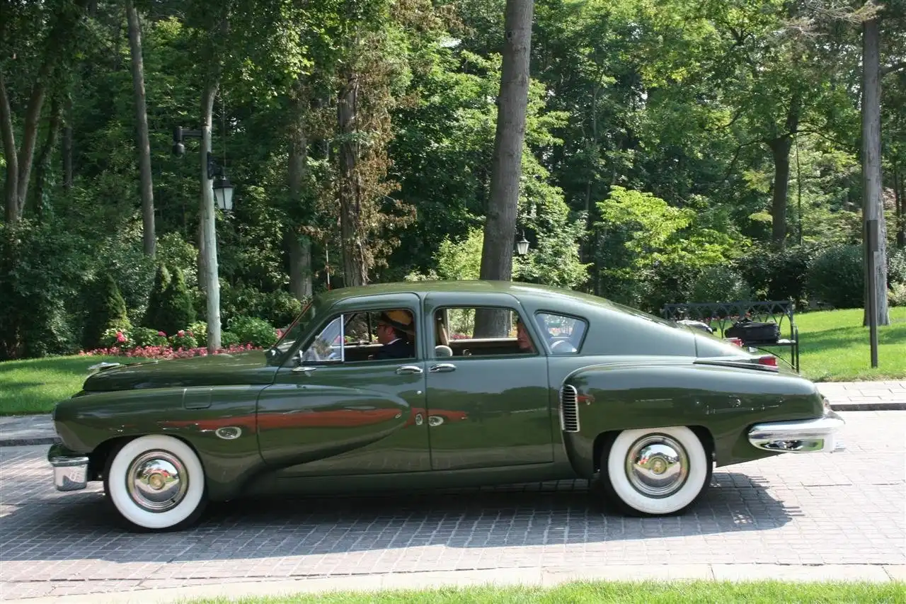 В 30-х для компании Ford Такер строил спортивные автомобили для знаменитых гонок в Индианаполисе. Скорее всего его гоночная биография и определила фирменные черты Tucker Torpedo: порывистость, новизна, нестандартность. Место водителя в автомобиле было расположено на продольной оси с пассажирскими сиденьями по бокам. Салон защищался силовым каркасом. Плоский оппозитный двигатель от вертолета Bell был размещен в хвосте. Вдобавок автомобиль имел перископ заднего обзора. Был снабжен индикацией показаний датчиков на ветровом стекле и даже ремнями безопасности. Следует упомянуть о том, что последние исключили, что бы не отпугнуть клиентов. Даже коробку скоростей приняли автоматическую.