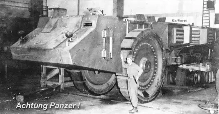 Первым был Alkett Minenraumer. В 1941 году фирма Alkett при содействии Krupp и Mercedes-Benz приступила к созданию самоходного минного тральщика. По задумке инженеров, эта машина должна была самостоятельно уничтожать противопехотные мины противника путем банального наезда на них. Для этого бронемашина была оснащена тремя колесами. Передние два были ведущими и имели диаметр порядка 2,5 метров, а заднее управляемое было в два раза меньше. Для того чтобы после каждого взрыва не нужно было менять все колесо, на ободе размещались трапециевидные опорные платформы, по десять на ведущих колесах и 11 на рулевом. Действовала система так. Установленные на шарнирах платформы буквально наступали на мину и приводили в действие ее нажимной взрыватель.