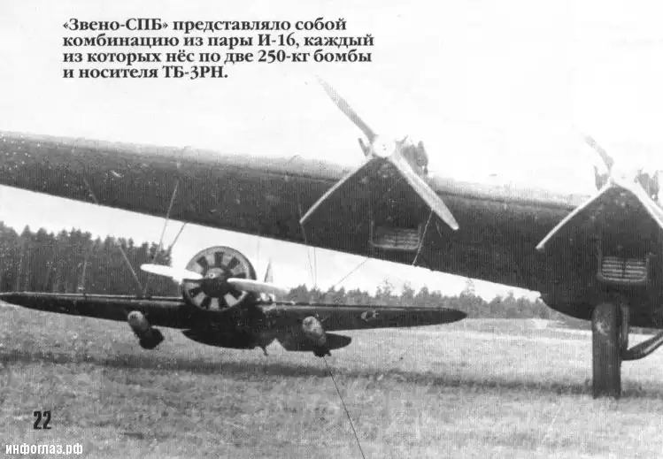 Тогда решили применить «Звено». ТБ–3, пройдя над морем, незаметно доставил пару И-16 близко к цели. «Ишаки» отцепились и спокойно вышли на мост. Зенитчики знали, что никакому советскому истребителю не хватит горючего долететь до их объекта, поэтому на появление одномоторных самолетов никак не среагировали. Как на полигоне, летчики атаковали мост и выполнили задачу – а на обратную дорогу топлива у них хватило. Увы, применение «Звена» было хоть и ярким, но все-таки эпизодом. Летчиков, умеющих стартовать с «воздушного авианосца», использовали как обычных истребителей, и вскоре большинство из них погибли. К тому же успех атак моста был основан именно на внезапности, так что массовое применение «Звеньев» вряд ли было бы эффективным.