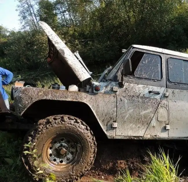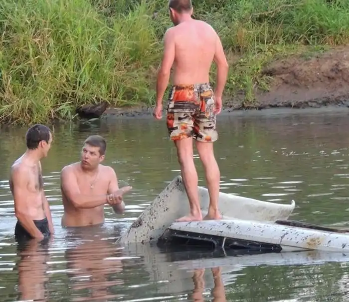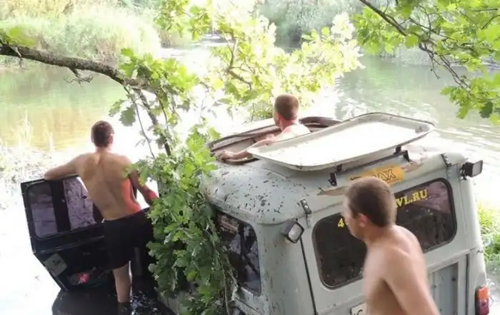 На минувших выходных парни решили съездить отдохнуть на природу. В самый разгар веселья, кому-то из них вдруг захотелось проверить, насколько крут отечественный УАЗик, на котором они, собственно, и приехали на природу. К сожалению, проверяли технические возможности УАЗика они не долго, зато теперь им всем точно известно, кокой глубины местный пруд ))