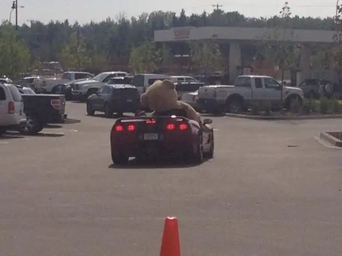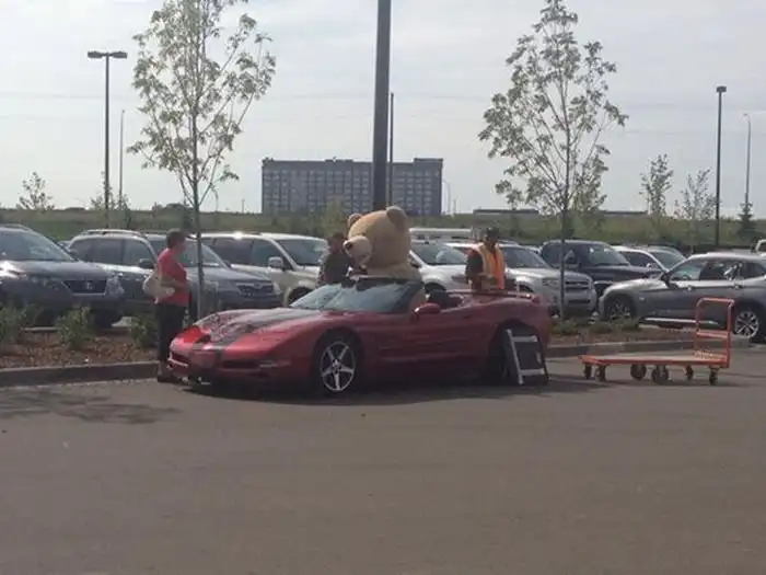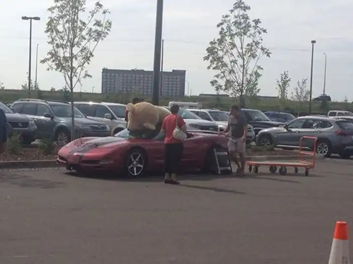 Владелец этого спортивного Chevrolett Corvette решил удивить свою возлюбленную и приобрел в магазине вот такой необычный подарок ;) Но сразу же после приобретения, парень столкнулся с одной "маленькой" проблемкой: "каким образом доставить этот подарок, ведь он действительно немаленьких размеров".. Со стороны, конечно, это всё смотрелось более, чем просто забавно ))