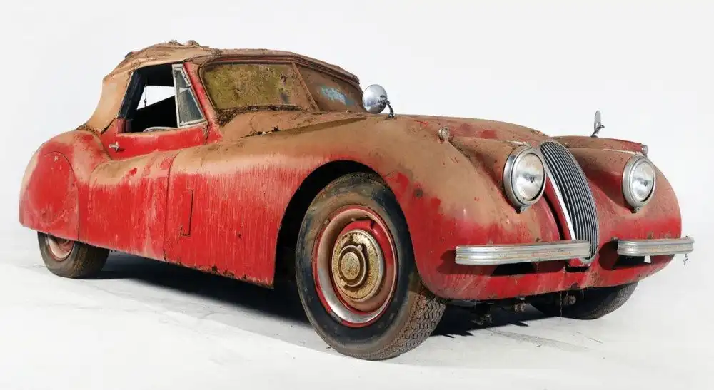 Jaguar XK120 SE 1954 года. С 70-х годов прошлого века стоял в обычном деревянном сарае в Джорджии, где и был найден. Ожидаемая цена продажи 80 000 долларов.