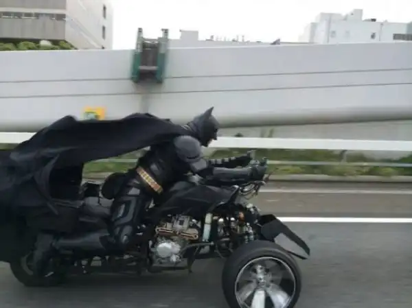 В японском городе Тиба появился собственный "Темный рыцарь", который рассекает по улицам на трехколесном байке. Зовет себя Тибэтменом и предпочитает скрывать свою личность. Однако, известно, что мужику 41 год и он работает сварщиком, так что свой мотоцикл сварил сам на базе квадроцикла. Общие затраты составили порядка 5 700 долларов.