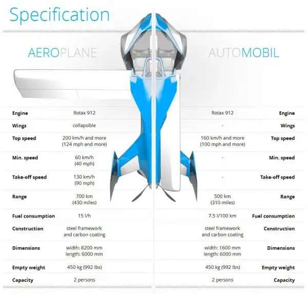 Транспортное средство, чья длина составляет ровно 6000 миллиметров, оснащено стандартным двигателем для самолета Rotax 912. Его мощность составляет 100 лошадиных сил. Крылья у Aeromobil 2.5 полностью складные, так что особых проблем с габаритами во время движения по дорогам возникнуть не должно. Если рассматривать Aeromobil 2.5 как автомобиль, то перед вами двухместный родстер. Топлива в баках хватит для преодоления 875-ти километров. В то же время, максимальная скорость полета составляет 200 км/час. Кузов выполнен из легковесного карбона