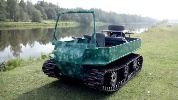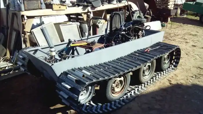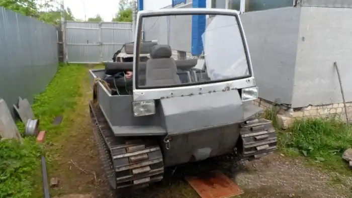 Один парень из глубинки решил сделать из подручных средств в гараже своего загородного дома настоящий вездеход на гусеничном ходу. Для его сборки был использован двигатель и КПП от Ваз 2108, а задний мост от классики. Что самое интересное, в итоге получился отличный самодельный вездеход, которого точно бездорожьем не испугаешь.