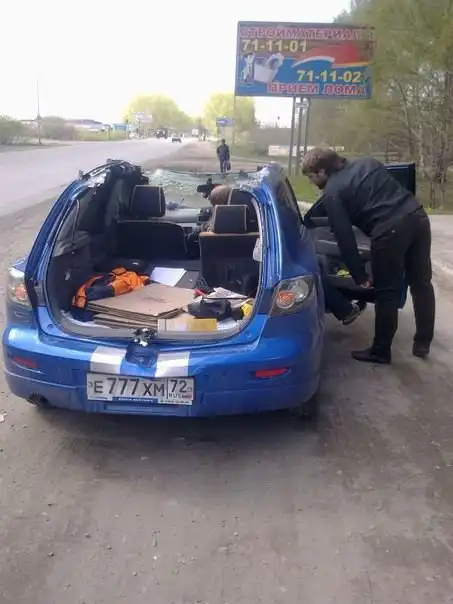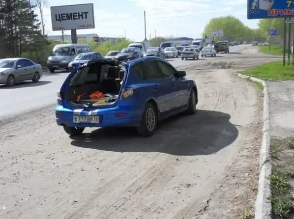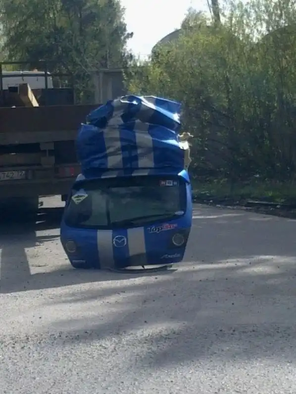 г. Тюмень, Ялуторовский тракт, Mazda Axella двигалась в сторону города за длинномером груженым швеллером , длинномер поврачивал налево мазда, не рассчитала и зацепила крышей швеллер торчащий за пределами кузова, все живы.