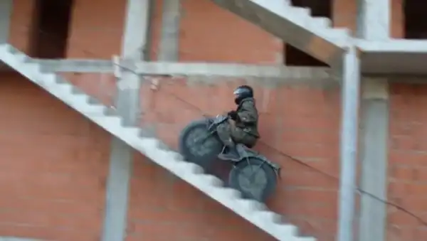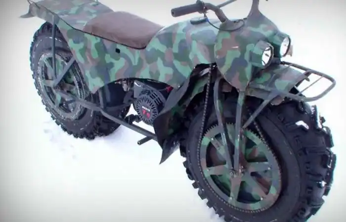 Мотовездеход оснащен двигателем от мини-мотоцикла и трёхскоростной коробкой передач. Максимальная скорость апокалипсического мотоцикла – 60 кмч. Угол поворота – 55 градусов.
