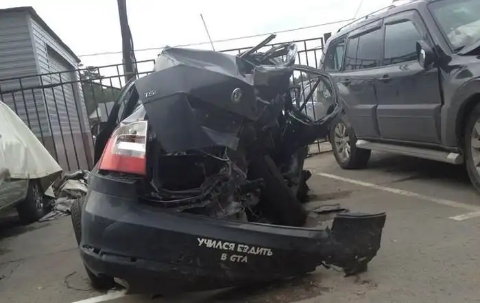 Вот такой автомобиль марки «Skoda», на заднем бампере которого красуется наклейка «Учился ездить в GTA», теперь находится на штрафплощадке ГАИ и совершенно не подлежит восстановлению.