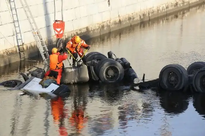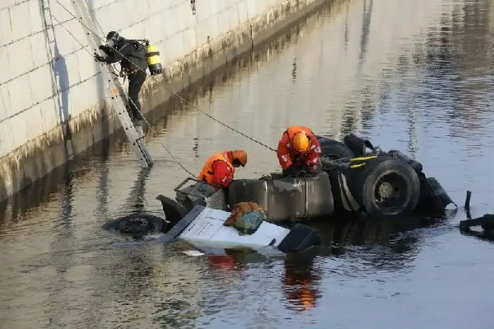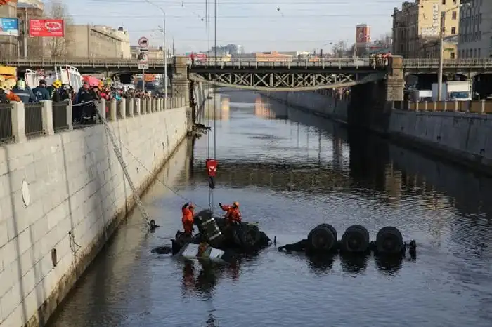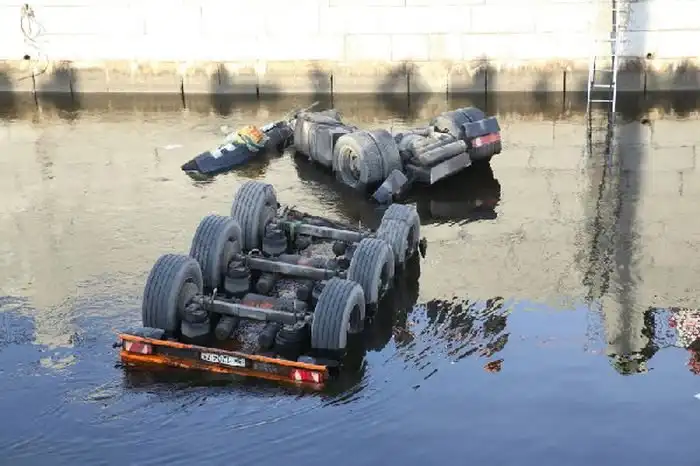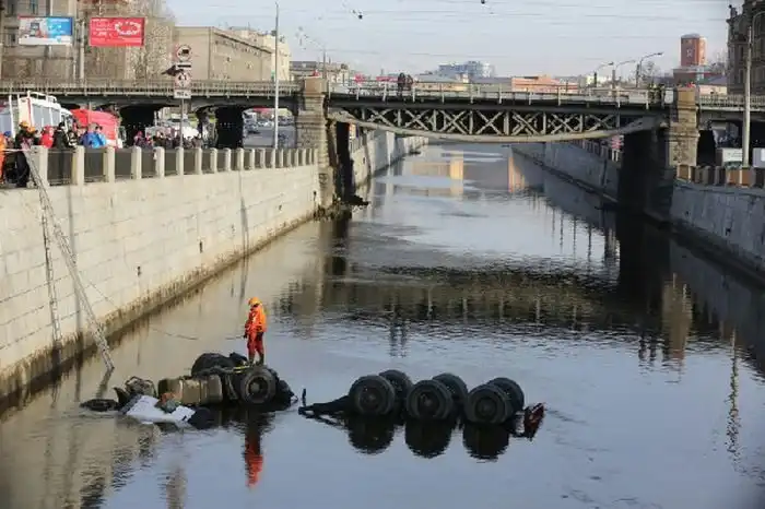 Вчера днем в Санкт-Петербурге, на пересечении Введенского и Обводного каналов, произошло ДТП, в результате которого в воде оказался бензовоз. Грузовик протаранил несколько легковых автомобилей, пробил ограждение и рухнул в Обводной канал.