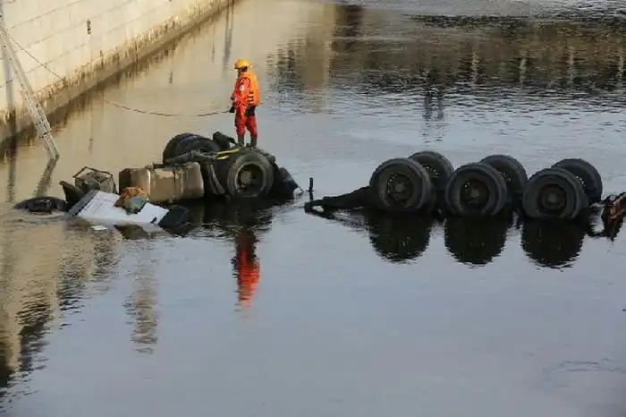 По предварительной информации у машины отказали тормоза. На месте аварии работали сотрудники МЧС, которые обследовали бензовоз и заявили, что утечки нет. Мазутные пятна на воде связаны с тем, что сам автомобиль был грязным. Позже по отдельности подняли тягач и цистерну.