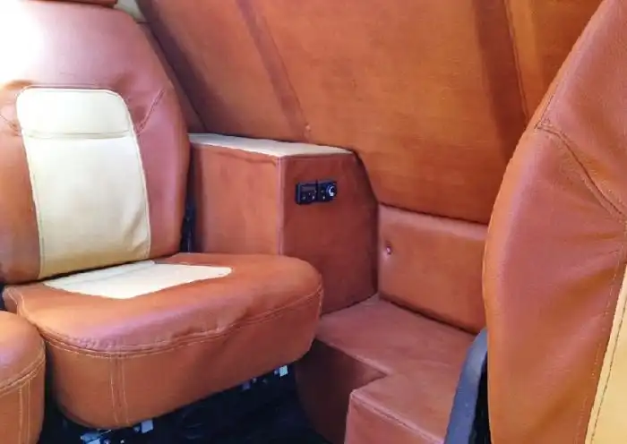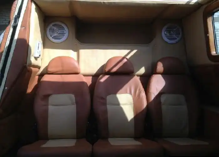 Для комфорта установлен кондиционер. Также внутри есть три розетки по 12В, дополнительное освещение, мощная акустика, полностью новая обшивка и удобные сиденья.
