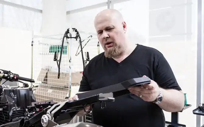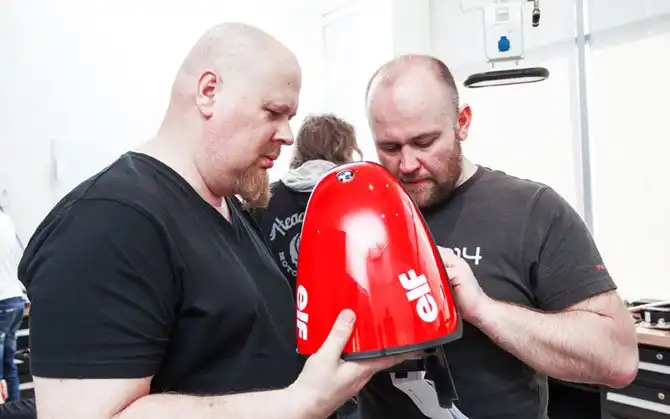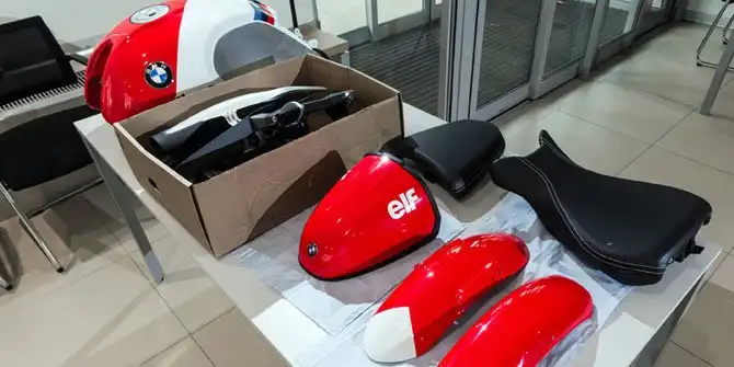 Вот этим. С надписью elf. Сам колпак – стандартный. Он идет в комплекте с мотоциклом и владелец может сам решить, что ему больше нравится – второе сиденье или обтекатель. Мы выбрали обтекатель и тоже покрасили его в красный цвет. Изначально он был серебристым.