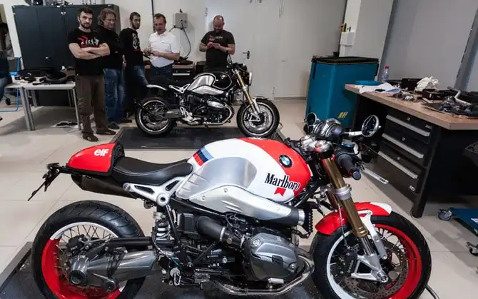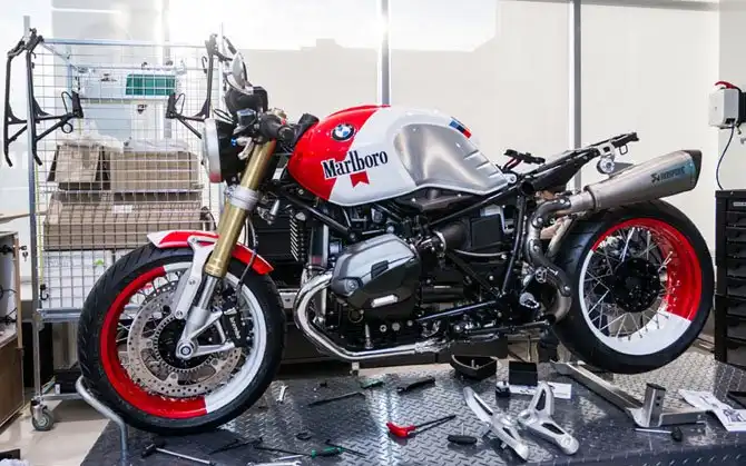 Здесь написано Marlboro, потому, что по задумке наших креативщиков, этот nineT станет репликой «боевых» мотоциклов заводской команды BMW, которые в 80-х годах участвовали в ралли Париж – Дакар (BMW R 80 GS Marlboro Elf sport Dakar). Знатоки? Так? Поправьте, если ошибся.