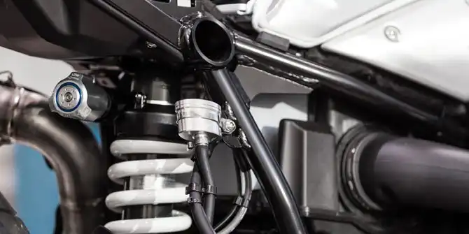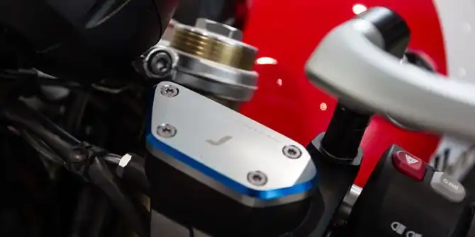 Еще один расширительный бачок – задней тормозной системы. Штатный был черный, пластмассовый. Мы поставили блестящий из полированного алюминия. Подстать ему ручка регулировки заднего амортизатора. Тоже никак не вставала. Оказалось, что под нее тоже нужен специальный адаптер. А он… Правильно! Был в отдельной коробочке.