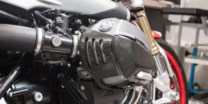 Карбоновые накладки на головки цилиндров. Снизу на них даже приделан слайдер. Но о том, что такую красоту можно положить на бок, даже думать не хочется! Кстати, а что стоит дороже? Стандартная крышка головки или такая вот защита? Никто не знает?