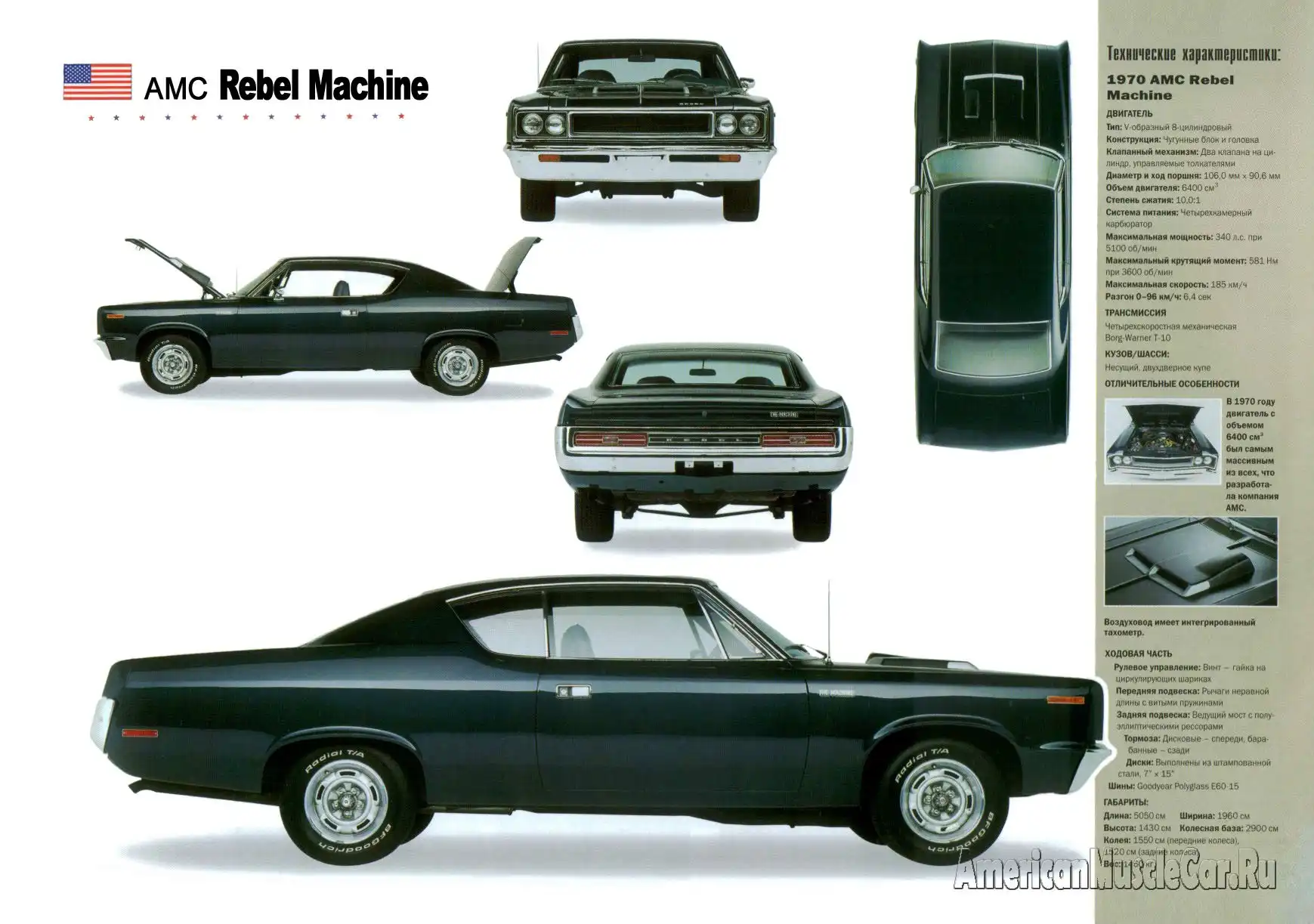 AMC Rebel Machine 1970Базовый 290-й (4,8 л) V8 двигатель был заменен на новый 304-й (5,0 л) 213 л.с. ( 157 кВт). Более мощный 343-й (5,6 л) также вытеснен 360-ым (5,9 л) V8. Он был доступен с двухкамерным карбюратором 248 л.с. (183 кВт) и четырехкамерным карбюратором 294 л.с. (216 кВт). Для особо мощной версии AMC Rebel SST был доступен 390-й (6,4 л) мощностью 330 л.с (242 кВт). Но и это еще был не самый производительный двигатель. Начиная с середины 1970-го года, вводится надстройка к SST - "The Machine", которая использовала форсированный двигатель, мощностью 345 л.с. (254 кВт). Это был самый мощный двигатель, созданный AMC для серийного автомобиля! Для него даже коленвал с толкателями производили из кованой стали, а не из чугуна. Величина крутящего момента, кстати, составляла 581 Нм, и была идеальной по соотношению к весу автомобиля.