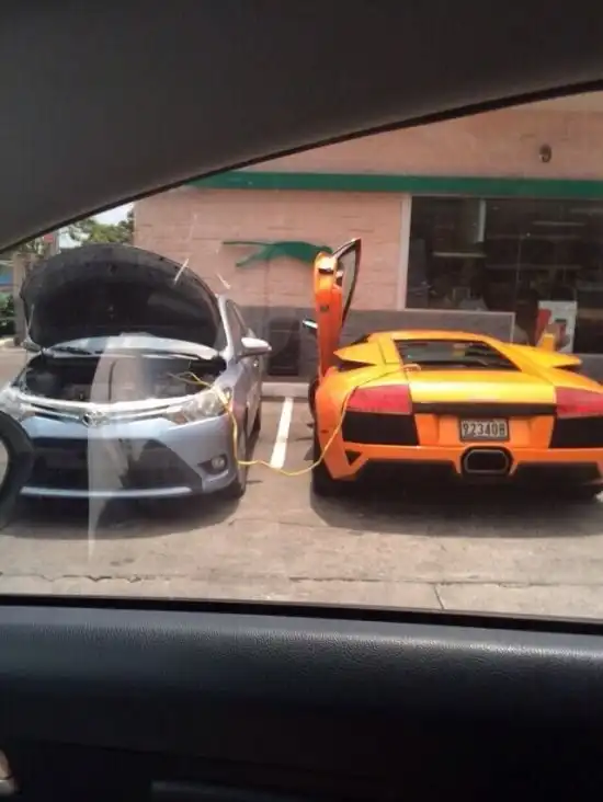 В жизни бывает так, что аккумулятор вашего автомобиля разряжается в самый неподходящий момент. Случаются подобные истории и с владельцами дорогих суперкаров, например, именно это и произошло с хозяином этого купе Lamborghini Murcielago. Однако его не бросили в беде и помогли, а помощь эту он нашел в лице собственника компактного хэтчбека Toyota Yaris.