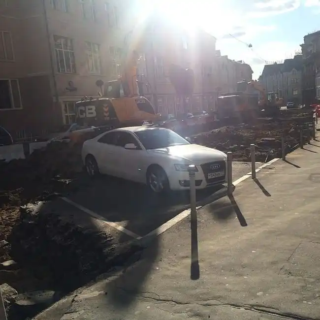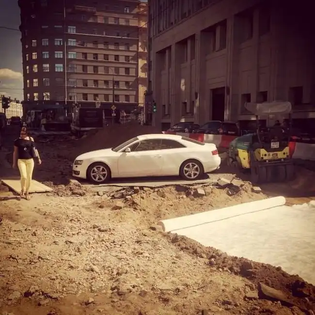 Вот такую картину недавно могли наблюдать жители Москвы на улице Кузнецкий Мост, где решено было полностью переделать дорожное покрытие. Кто-то не забрал свой автомобиль, однако, рабочих это не остановило, и они выполнили поставленную перед ними задачу.
