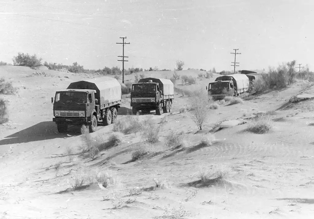 КАМАЗ-43103 и КАМАЗ-43101 возглавляют испытательную колонну на трассе песков Чарджоу-Мары (Туркменистан).