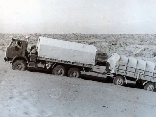 Прототип автомобиля КАМАЗ-4310 с прицепом ГКБ-817Б на испытаниях в Средней Азии.