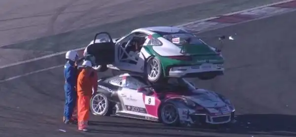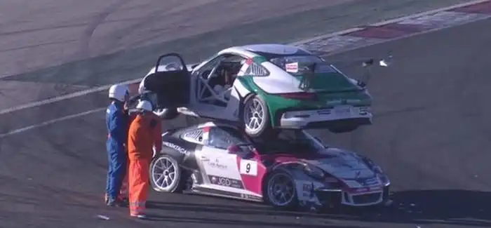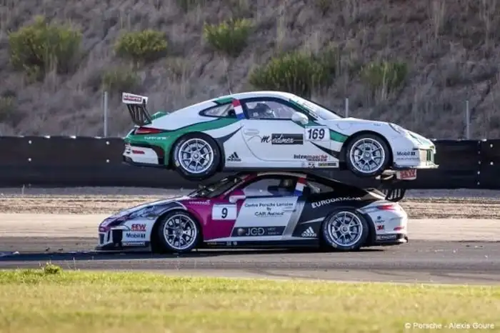 На одном из этапов Французского монокубка Porsche случилась авария, в результате которой автомобиль Жюля Гунона заехал на крышу машины Джофри де Нарда. Инцидент произошел во время поворота, когда один из болидов развернуло, а другой в этот момент столкнулся с другим спорткаром. В таком положении автомобили и остались до вмешательства техников, а пока их убирали с трассы, гонку пришлось остановить.