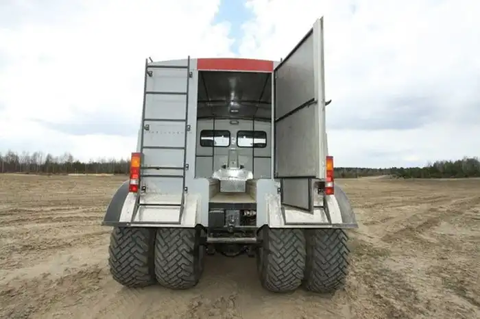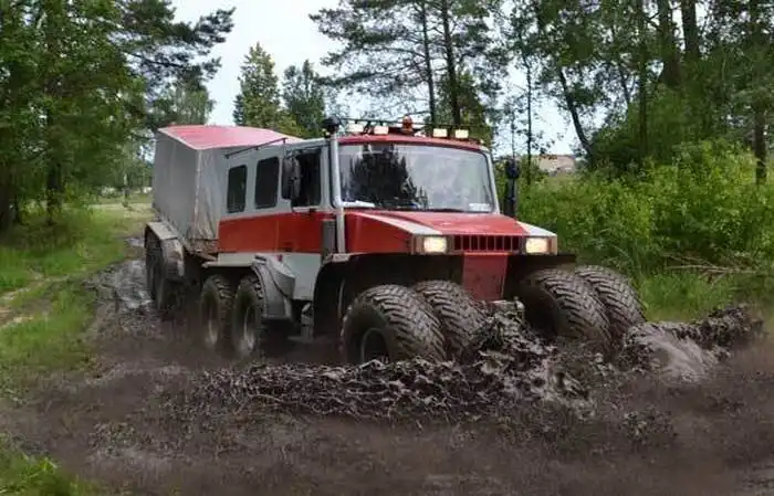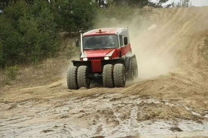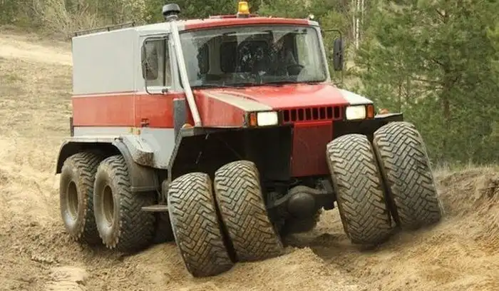 Перед вами уникальный белорусский вездеход «Пегас», построенный по индивидуальному заказу на одном из заводов страны. Трехосный автомобиль с шестью парами колес собран из узлов различных автомобилей и способен преодолевать практически любые преграды, в том числе и водные.