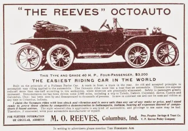 Первая машина называлась "Octoauto", а вторая "Sixauto", обе получили известность как "автомобильная авантюра мистера Ривза". "Octoauto" появился в 1910 году на основе серийного легкового "Overland" модели "38". Автомобиль отличался необычной плавностью хода и был не подвержен тряске, потому что, когда одно колесо этой восьмиколёсной громадины поднималось на бугор или опускалось в выбоину дороги, то остальные оставались на своём обычном уровне. Шесть колёс были сделаны поворачивающимися, они связывались друг с другом сложной системой тяг. Первый "Octoauto" после участия в первой гонке "500 миль в Индианаполисе" был продан бизнесмену из Чикаго Элберту Хабберду, который написал двухстраничную статью в журнале "Безлошадный век" о том, насколько приятно водить четырёхосный "Overland" по тогдашним чикагским улицам, не отличавшимся хорошим дорожным покрытием.