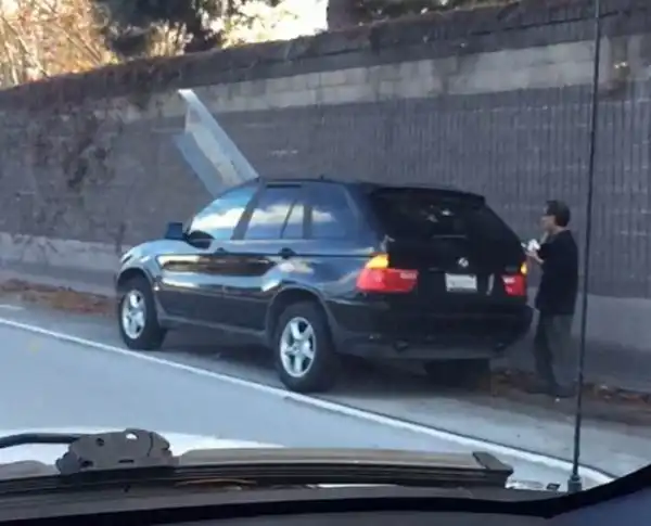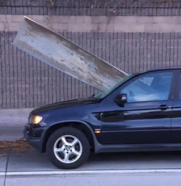 Этому водителю нереально повезло. В то время когда он проезжал под мостом, к нему в лобовое стекло залетела большая металлическая балка. Каким-то чудом водитель остался совершенно не вредим.