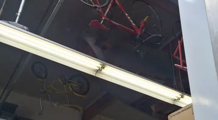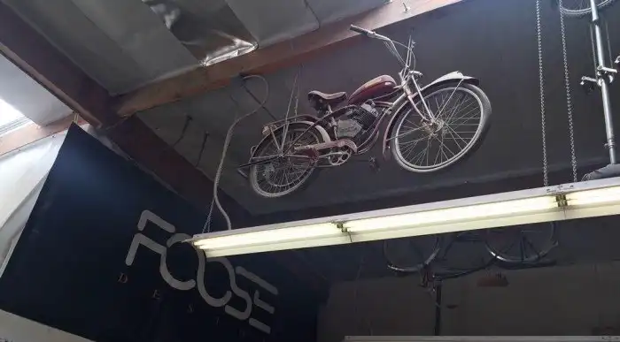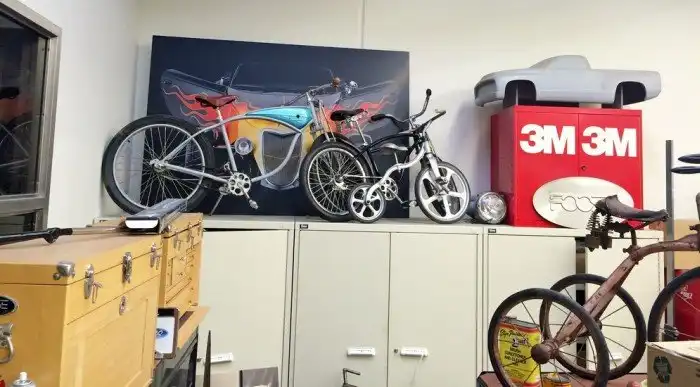 Еще больше было велосипедов – Фуз большой фанат двух колес, в детстве он мечтал стать BMX-ером, но, к счастью, стал лучшим в мире дизайнером. Однако любовь к велосипедам не прошла, и количество самых разнообразных экземпляров по всей мастерской просто зашкаливает. Ее стены и потолок также завешаны капотами и другими деталями гоночных автомобилей, дизайн которых разрабатывал Фуз. Каждый элемент мастерской, от стульев до станков, украшает его логотип с пальмами.