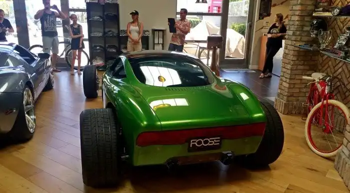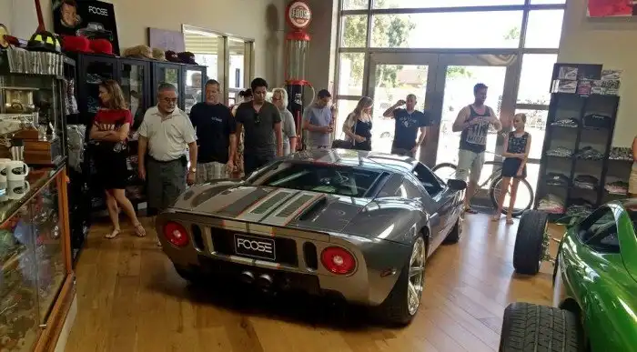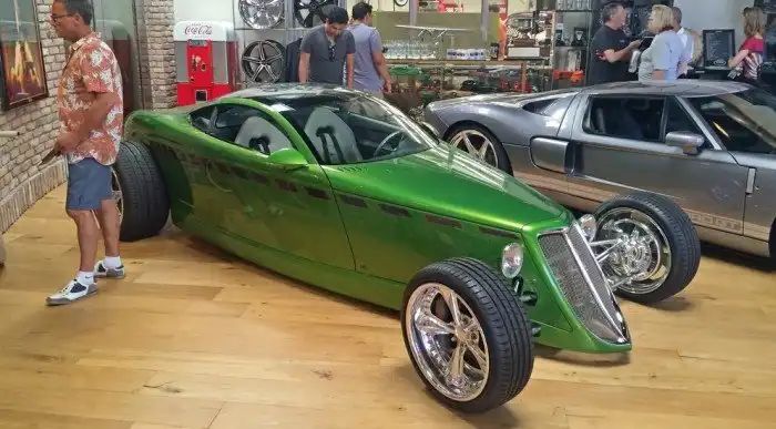 Заканчивается экскурсия в сувенирной лавке, где вас порадуют два редких и уникальных автомобиля: Ford GT – машина мечты самого Фуза, которую он купил недавно, и Hemisfear – один из первых проектов Чипа. Изначально зеленый хот-род Фуз строил для себя, но затем его пустили в небольшую серию из 50 автомобилей. Лишь один из всех существующих окрашен в черный цвет, все остальные зеленые. По задумке Чипа этот автомобиль должен был обладать лучшими характеристиками суперкара, хот-рода и масл-кара.