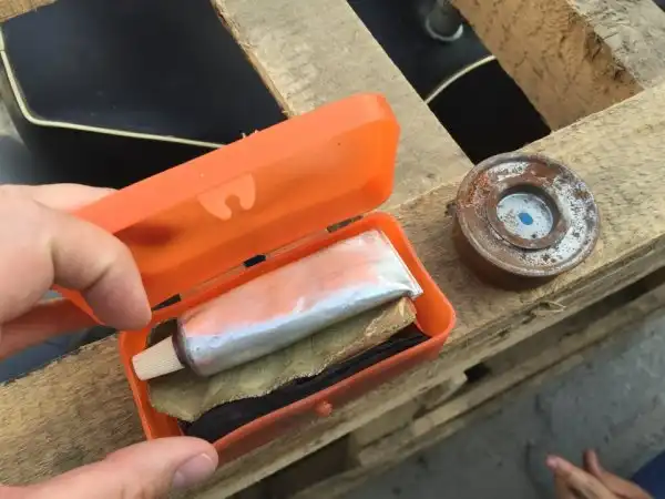 Интересный артефакт был обнаружен в левом боковом бардачке. Рядом с аккумулятором там находилась аптечка для ремонта шин! Внутри — тюбик с высохшим клеем, комплект латок для камер, наждачная бумага, а также руководство пользователя.