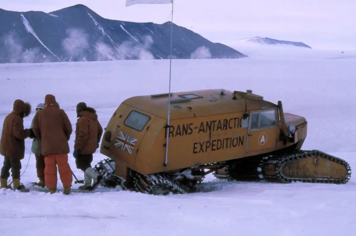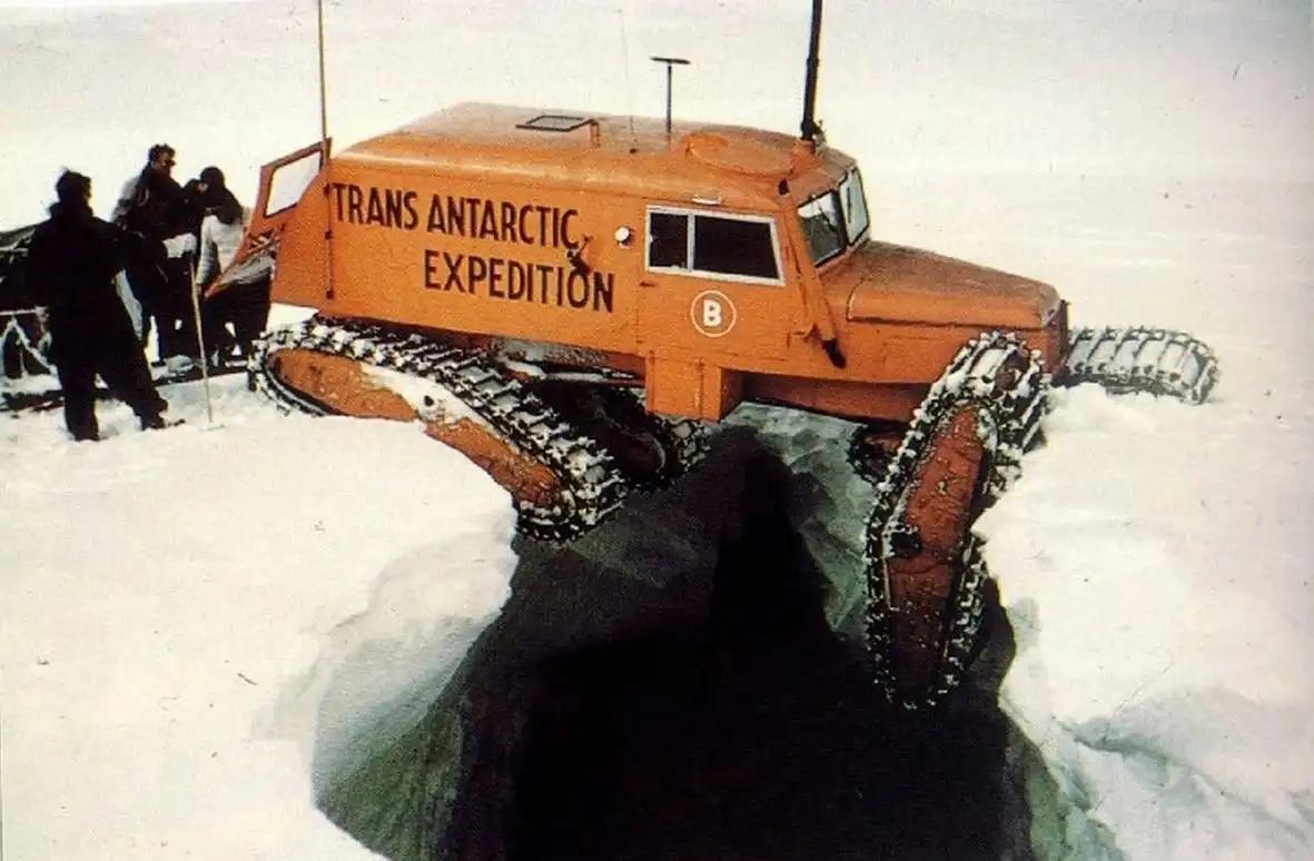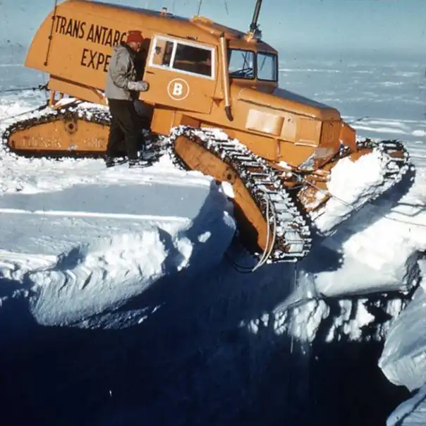 "Ко времени нашего отбытия все машины уже получили от водителей прозвища. Выехали мы в следующем порядке: сноу-кэт «Рок-н-ролл» — характеристика, верная для всех машин этого рода, затем сноу-кэт «Эйбл» — это имя дал машине Дэвид Пратт, за ним два «Уизела» Аллана Роджерса и Джорджа Лоу — «Грохот» и «Крушение», за ними шел трактор «Маскег» — «Прыгун» с эмблемой в виде прыгающего кенгуру, названный так нашим австралийцем Ионом Стивенсоном; колонну замыкал сноу-кэт «Графство Кент» — имя было дано ему Роем Хомардом, родившимся в этом графстве. Несмотря на поздний отъезд, мы все же прошли 15 миль, прежде чем начать ставить палатки. Партия также нашла и забрала с собой сани с двенадцатью бочками горючего, оставленные на дороге, когда «Уизел» Роя на второй день разведывательного похода в Саут-Айс вернулся в Шеклтон. 25-го мы благополучно пересекли заполненные снегом трещины-ущелья и, пройдя 14 миль, решили, что уже вступили в период больших переходов. И тут в мгновение ока под сноу-кэтом «Рок-н-ролл» провалилась снежная перемычка, а Дэвид Стреттон и я повисли в воздухе над внушительной трещиной-ущельем. Ширина сделанной нами дыры была около 15 футов, а глубина до первого уступа на стене трещины под нами равнялась 60 футам. Выглянув на правую сторону, я увидел, что положение более чем неприятное: невозможно было решить, насколько прочно машина заклинилась между краями трещины, и не на что было ступить, чтобы выйти из нее. Однако на своей левой стороне Дэвид обнаружил, что он может добраться до заднего понтона, и я последовал за ним ползком наружу по висевшей в пространстве гусеничной цепи, похожей на лестницу.