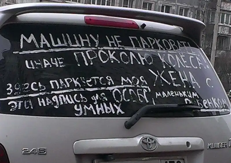 "Хозяин" парковочного места, после письменных угроз на заднем стекле, похоже заработал себе статью за порчу чужого имущества.