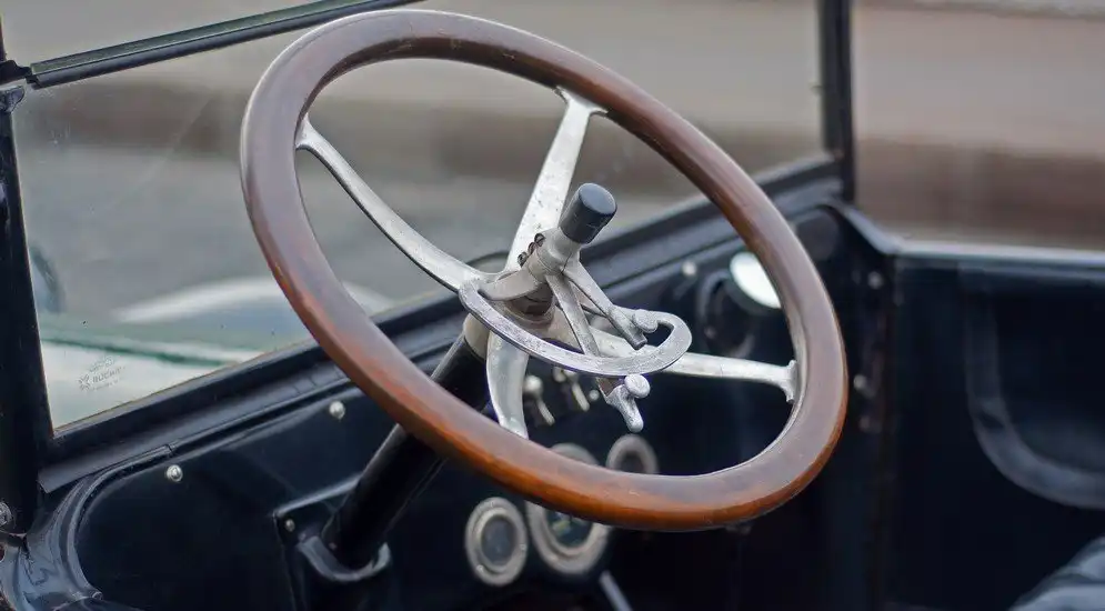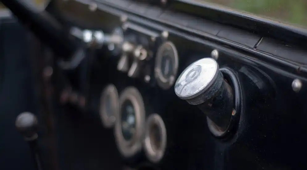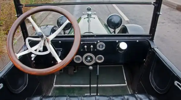 Допустим, нам удалось залить воду в радиатор. Положим даже, что смогли залить керосин. Теперь заливаем его через краники декомпрессора в каждый «горшок». Возникает следующая проблема: с абы как выставленным углом опережения зажигания машина не заведётся, это знает любой ребёнок старше двадцати пяти лет. Ясное дело, никакого автомата опережения тут нет, не было и быть не могло. Рычажок его регулировки находится на руле, поэтому придётся кого-то посадить за руль, а кого-то заставить крутить заводную рукоятку. Зато температуру залитой воды лучше смотреть как раз таки не залезая на водительское место: этот указатель и есть та красивая штука на капоте. Забегая вперёд скажу, что из-за руля её видно плохо, поэтому визуальное наблюдение за температурой воды по большому счёту возможно только на уровне «кипит – не кипит».