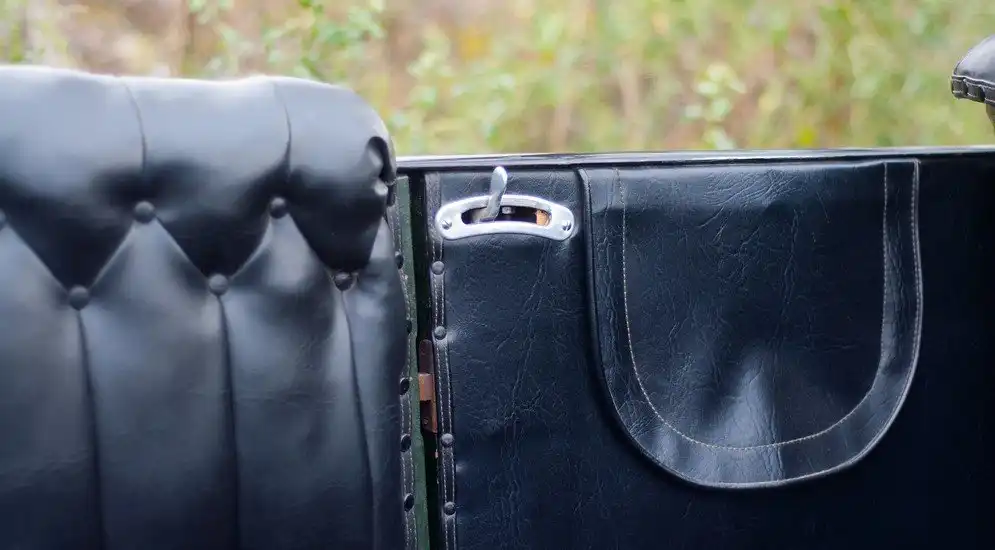 Наружных ручек у дверей нет: никаких стёкол тут не предусматривалось, поэтому все двери отрываются рычажком сверху. Даже не двери, а калитки: кузов-то деревянный, а такие замки и петли сейчас скорее встретишь на участке какого-нибудь садоводческого товарищества, а не в автомобиле. Но работает всё чётко, открыть дверь легко.