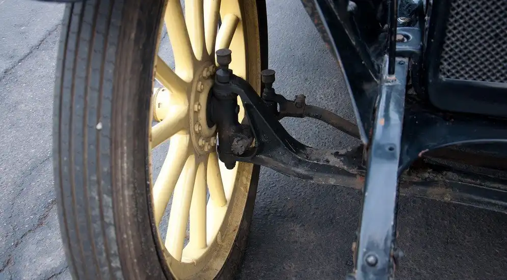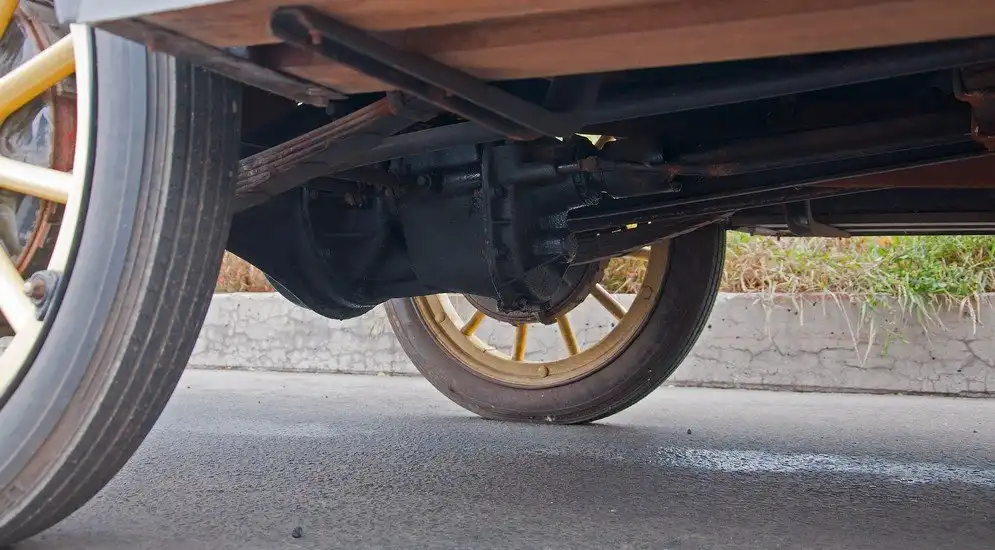 Подвеска Студебеккера, как я уже говорил, о существовании амортизаторов не знает. А вот рессоры здесь стоят не слабые, я бы сказал, даже чересчур. Под задней дверью виден небольшой лючок: если его отодвинуть в сторону, то появляется доступ к месту смазки задней рессоры. Маслёнки есть и на шкворнях передней подвески, и на наконечниках рулевых тяг. Зато впереди нет тормозных механизмов. Сзади они, конечно, есть, при этом самые суровые из всех возможных: ленточные. Их эффективность стремится к нулю, но, как помните, не так уж они тут и нужны, ими пользуешься, скорее, только при окончательной остановке.