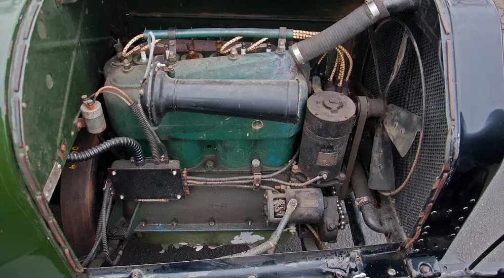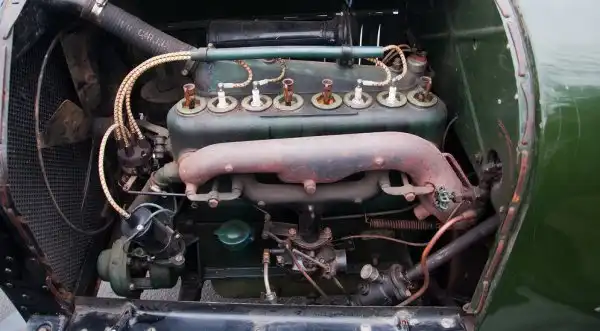 Размеры мотора, прямо скажем, впечатляют. Его объём – 3,146 л, он четырёхцилиндровый, но выглядит на все восемь. Почему? Потому что рядом с каждой свечёй зажигания мы видим краники декомпрессоров для каждого из цилиндров. Повернул краник – есть компрессия, повернул снова – её нет. Зачем? Конструкторы одним декомпрессором убили сразу двух зайцев.