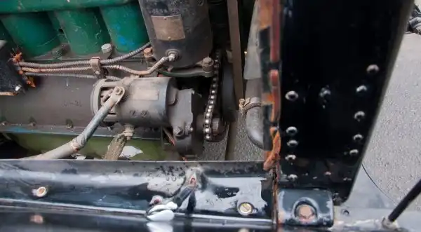 У машины в арсенале припасена одна вещица, которая по техническому прогрессу современности стояла бы где-то чуть дальше системы открывания багажника «hands-free» от Форда, но чуть не дотягивала до, например, модуля управления зеркалом заднего вида HomeLink от Вольво. И эта деталь – электрический стартер. Да ещё какой: с цепным приводом на коленвал. Соответственно, маховик тут привычного венчика не имеет. Но заводить им машину реставраторы не любят: не дай бог сгорит сама деталь или порвётся цепь. Ручка запуска куда надёжнее. После её активной работы одновременно с поиском нужного угла опережения мотор всё-таки заводится.