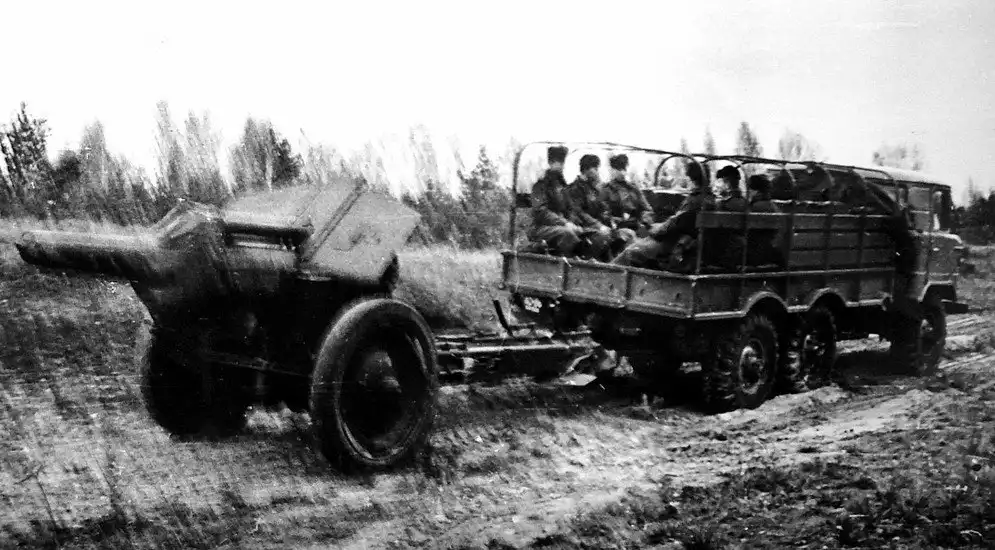 Тягач ГАЗ-34 с прицепной гаубицей М-30 калибра 122 мм (кинокадр)