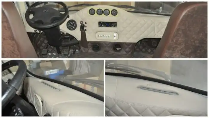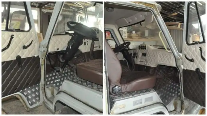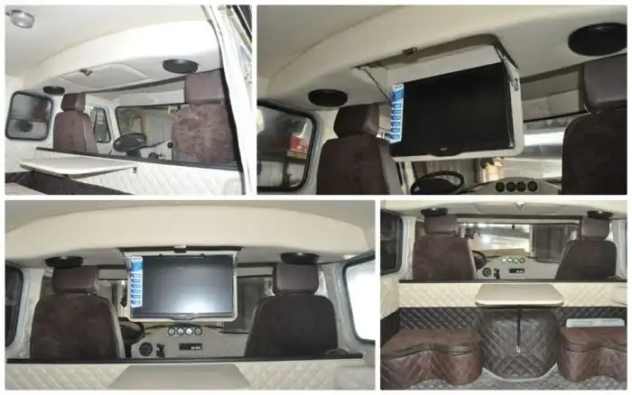 Перед вами совершенно уникальный салон обычного отечественного автомобиля УАЗ «Буханка». Авто отделали материалами более высокого качества, добавив повсюду ромбовидную строчку. Внутри появился раскладной диван и выдвижной телевизор. В итоге получился отличный автомобиль для загородного отдыха и путешествий по российской глубинке.