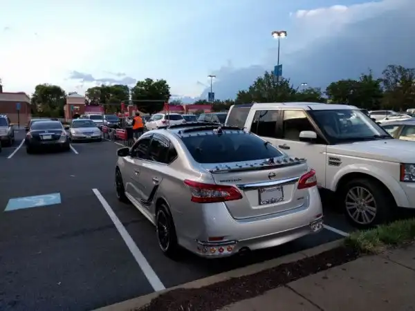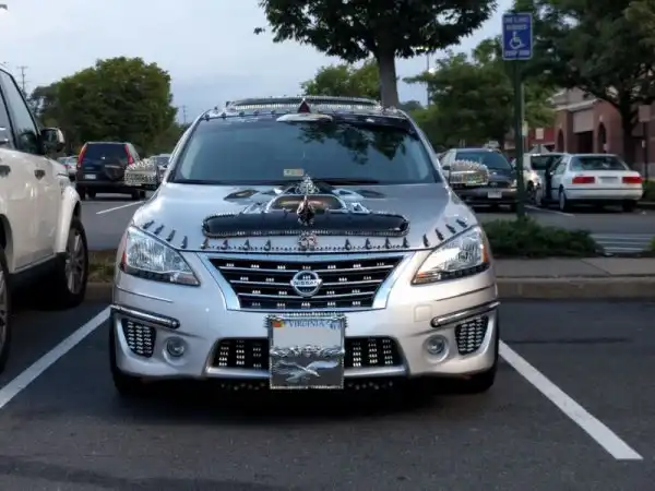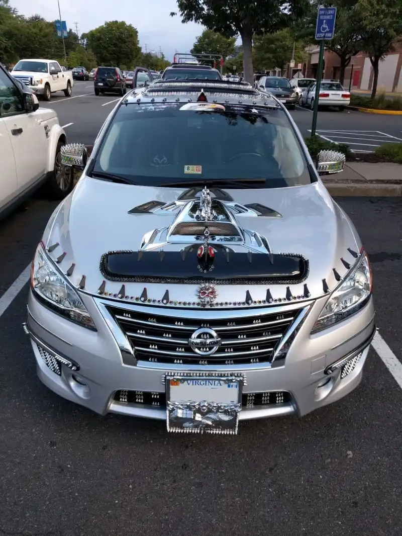 Один их жителей штата Вирджиния встретил на стоянке вот такую садо-мазо гравицапу. Какого только пирсинга не получил этот многострадальный Nissan от своего хозяина. Шипованный люк на крыше, фальшивые вентиляционные отверстия, липовые антенны - это лишь малая часть "украшательств".