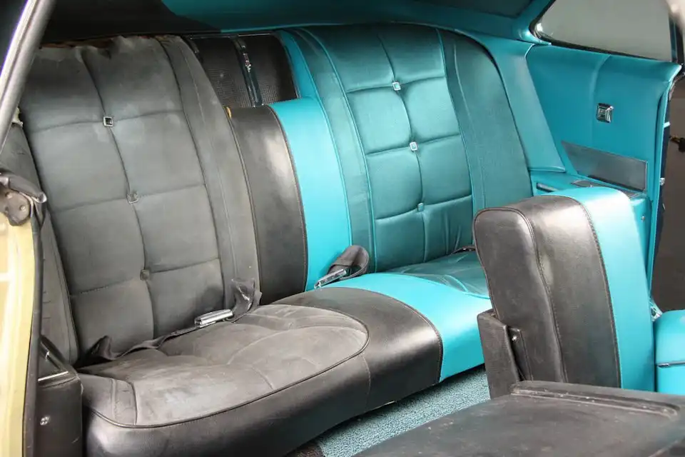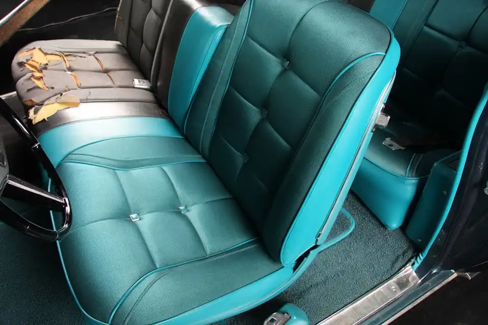 Водительская сторона автомобиля была полностью восстановлена до безупречного музейного состояния. Эту половинку машины окрасили красивейшим бирюзовым металликом Tahoe Turquoise, полностью обновили весь декоративный хром на бамперах и облицовке, перешили салон, используя аутентичные материалы, аналогичные заводским.