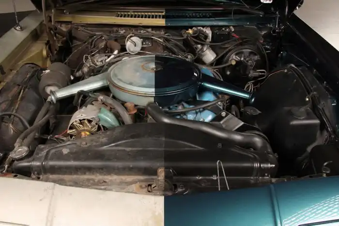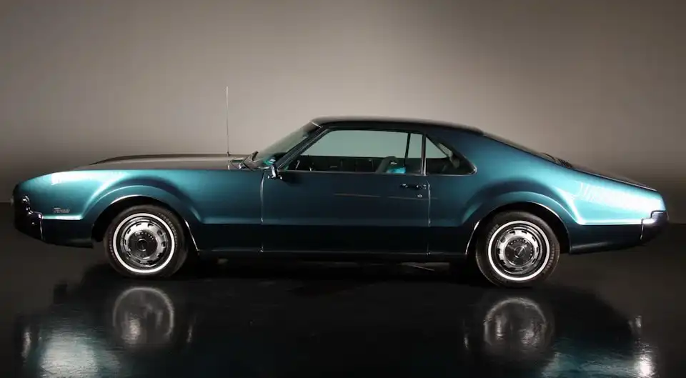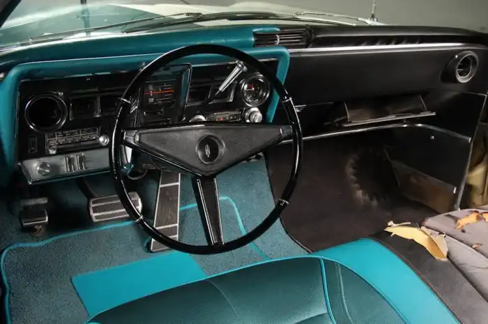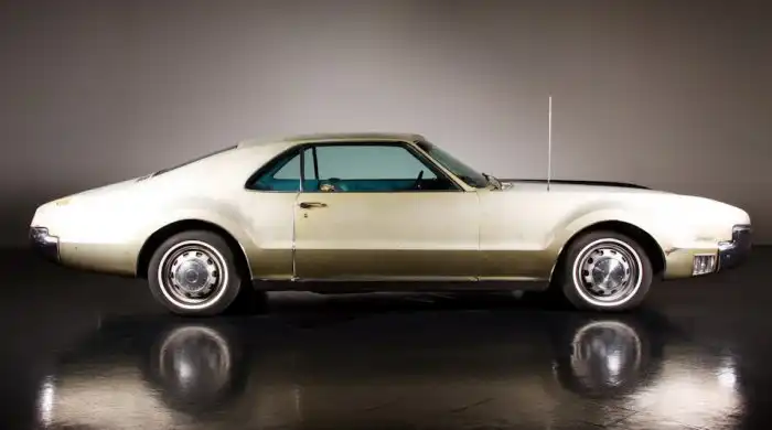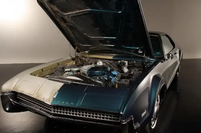 Реставрация также затронула механическую часть Oldsmobile Toronado: под капотом все новое ровно наполовину. Авто оснащено могучим 7,0-литровым мотором Super Rocket V8 мощностью 385 л.с., который работает в паре с 3-диапазонной автоматической коробкой передач Turbo-Hydramatic 400. Кстати, данная модель известна тем, что стала первой послевоенной американской машиной с приводом на передние колеса. Впечатляют габариты этого роскошного 2-дверного купе: длина — 5,4 метра!